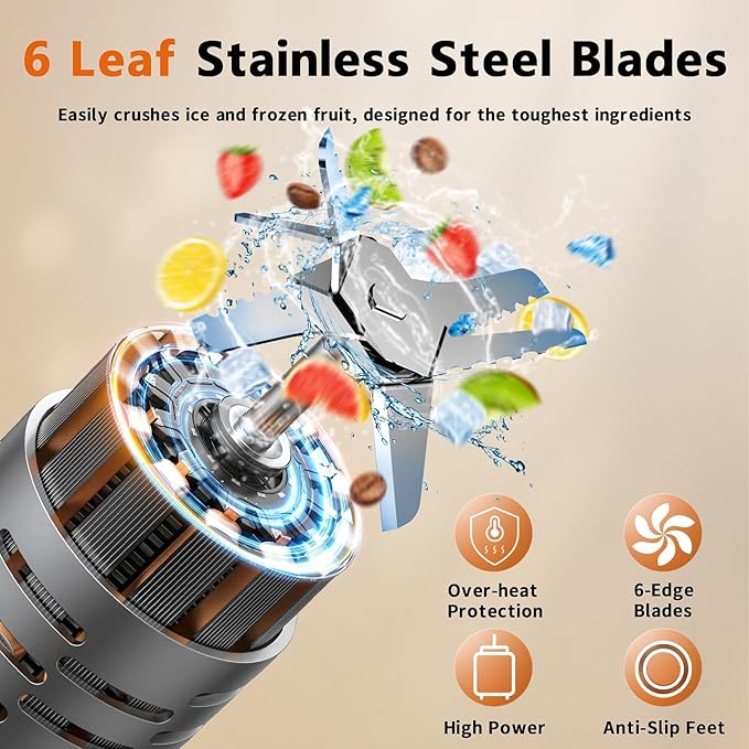 - 【Multi-Function Blenders】Your personal blender comes with stainless steel 6-blades, making it easy to blend various hard ingredients, even crushing ice. It is great for blending smoothies, juices, milkshakes, sauces, jams, and baby food. Powerful string flat blades use cyclonic action to break down tough ingredients, making them great for grinding coffee beans and spices.