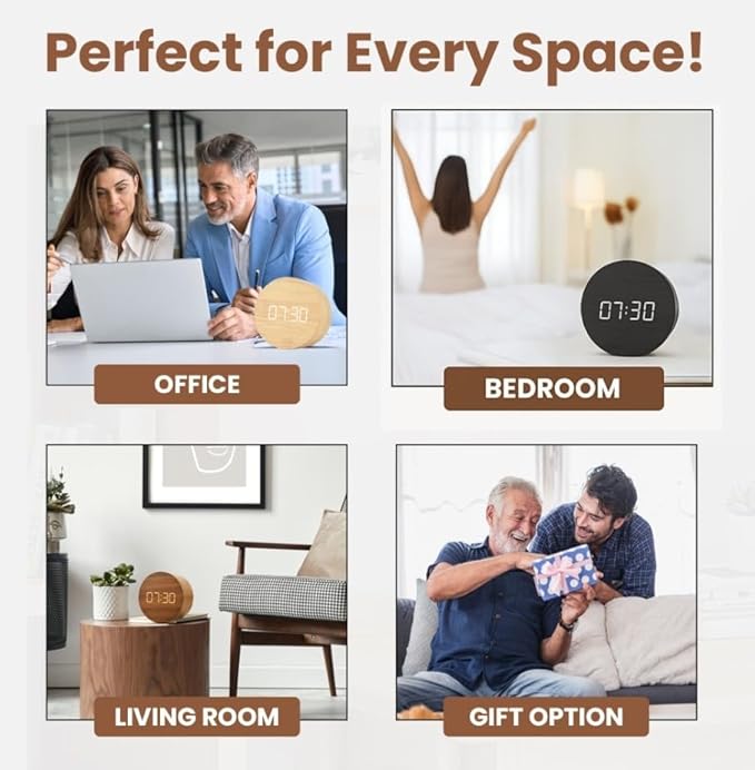 - Elegant Wooden Digital Alarm Clock: Crafted with a sleek wood finish, this clock seamlessly blends into any modern or minimalist room decor. The LED display the time clearly on the wood.
