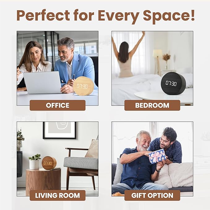 - Elegant Wooden Digital Alarm Clock: Crafted with a sleek wood finish, this clock seamlessly blends into any modern or minimalist room decor. The LED display the time clearly on the wood.
