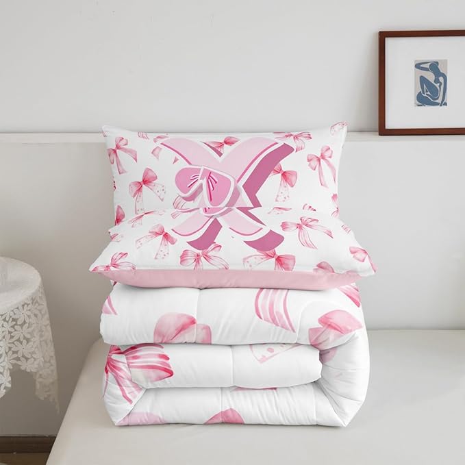 jejeloiu Kids Girls Cute Pink Bow Comforter Set King Size Monogrammed Bedding Set Ultra Soft Personalized Initial X Duvet Quilt Coquette Bow Knot Quilt Set Room Decor Modern Fashion Comforter