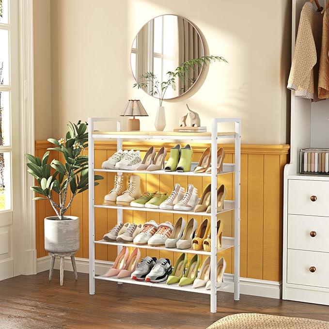 - 【Sturdy Shoe Rack for Entryway】Crafted from a robust metal frame and high-quality particle board, this entryway shoe rack can support up to 50 lbs on the top and 25 lbs on each shelf. The dense mesh design ensures that even high heels won't fall through. Additionally, it features adjustable feet for stability on uneven floors and raised back edges to prevent shoes from rubbing against the wall.