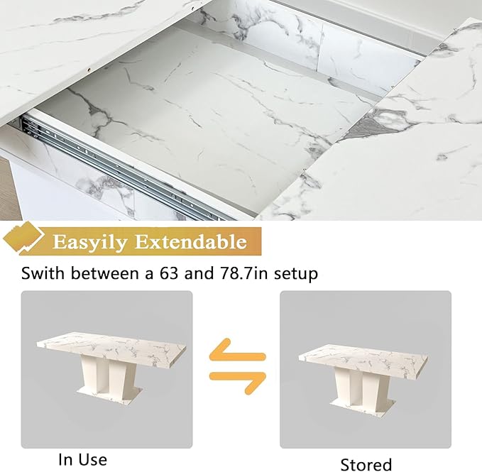 - Faux Marble Extendable Kitchen Table - This expandable table adopts a modern farmhouse style, White faux marble tabletop make this dining table elegant and natural. This wooden kitchen table is made of Engineered Wood tabletop and pedestal base, which is durable and stable. Whether it's a spill or a scratch, you can rest easy knowing that your table can withstand everyday usage.
