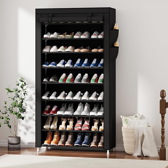Laiensia 9-Tier Vertical Shoe Rack Organizer, Space Saving Shoe Storage Organizer, Non-Woven Cover Shoe Shelf Holds 36-45 Pairs for Bedroom, Hallway, Closet Entryway, Black