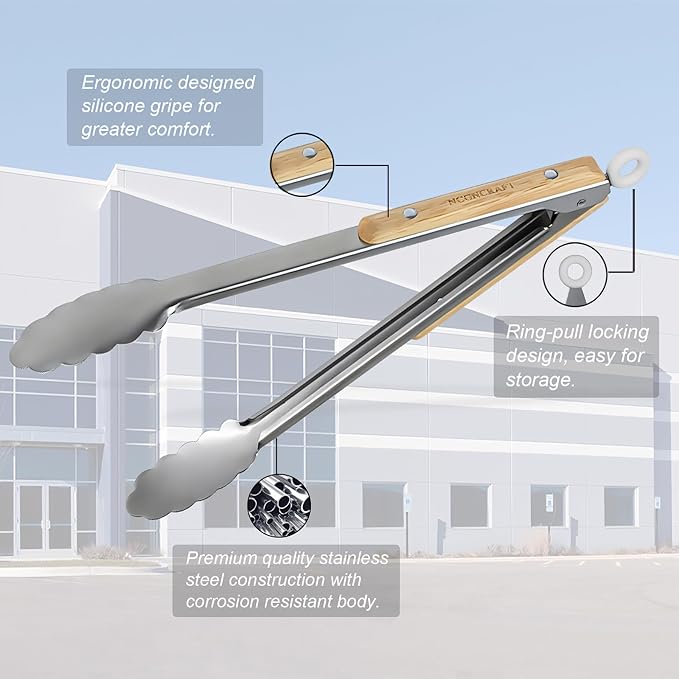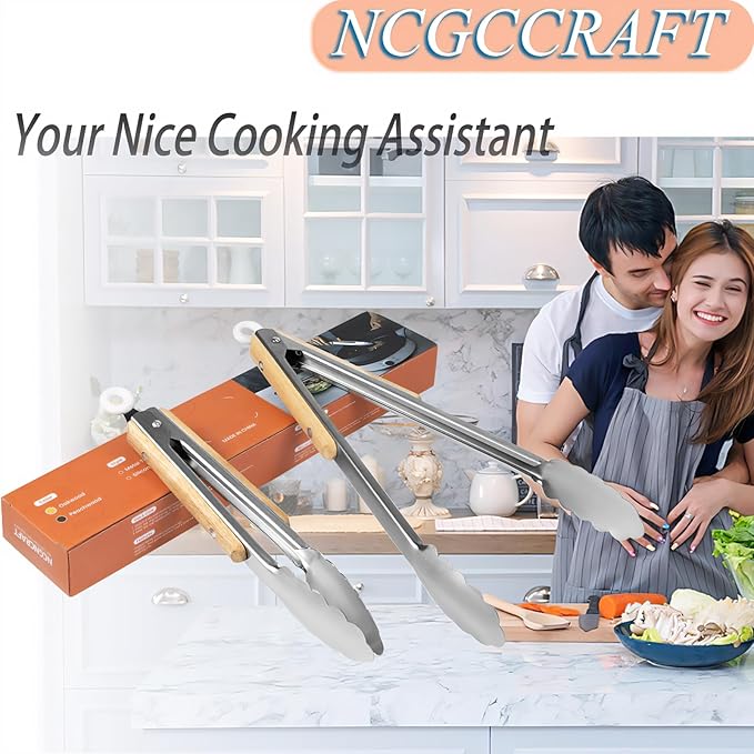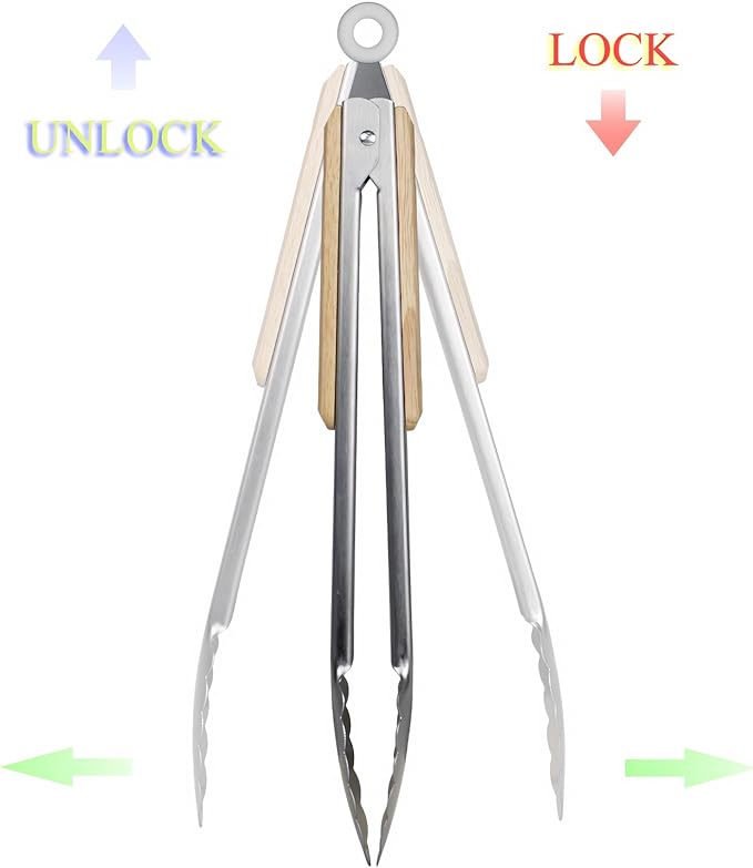 - Premium Oak Wood Handle & Stainless Steel Head - Our kitchen tongs feature a durable stainless steel head paired with a high-quality oak wood handle. The handle is treated with a rolling wax process, making it hard, corrosion-resistant, and long-lasting. The smooth, burr-free finish ensures a comfortable and safe grip.