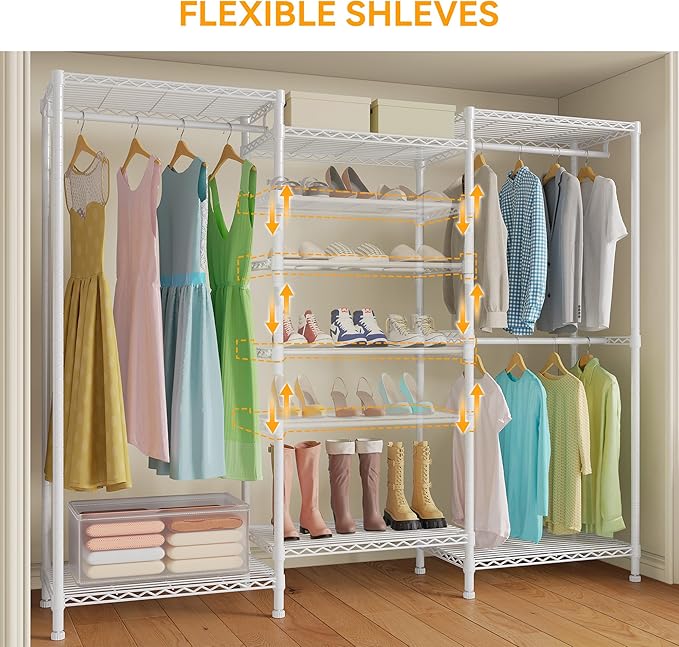 H12 Heavy Duty Clothes Rack with Adjustable 5-Tier Shoe Rack, Metal Clothing Racks for Hanging Clothes, Freestanding Shoe Organizer Large Garment Racks, 15.7" D x 68.7" W x 76.4" H, White