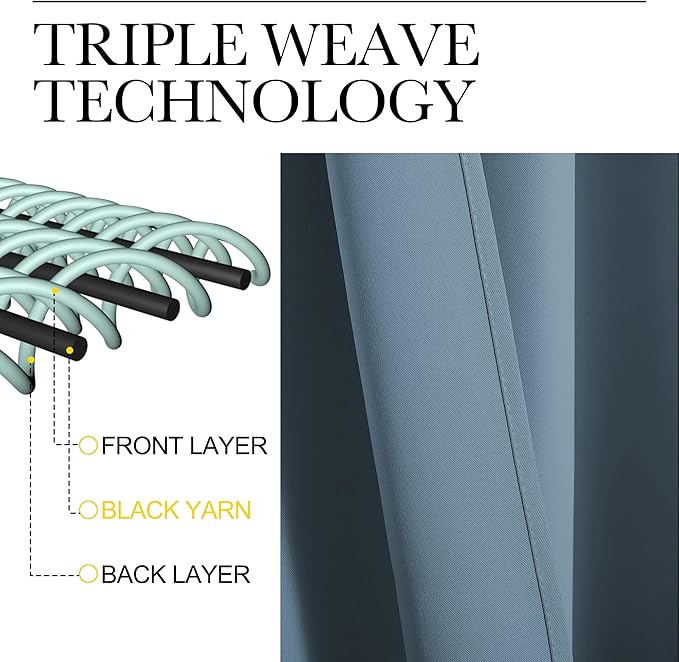 - MULTI-FUNCTION: Super heavy and soft Blackout Curtain Panels are very upmarket. Besides, 85%-99% light blocking, thermal insulated, soundproof, Fade-resistant, energy-efficient. Thread trimmed and wrinkle-free, both sides are the same color.