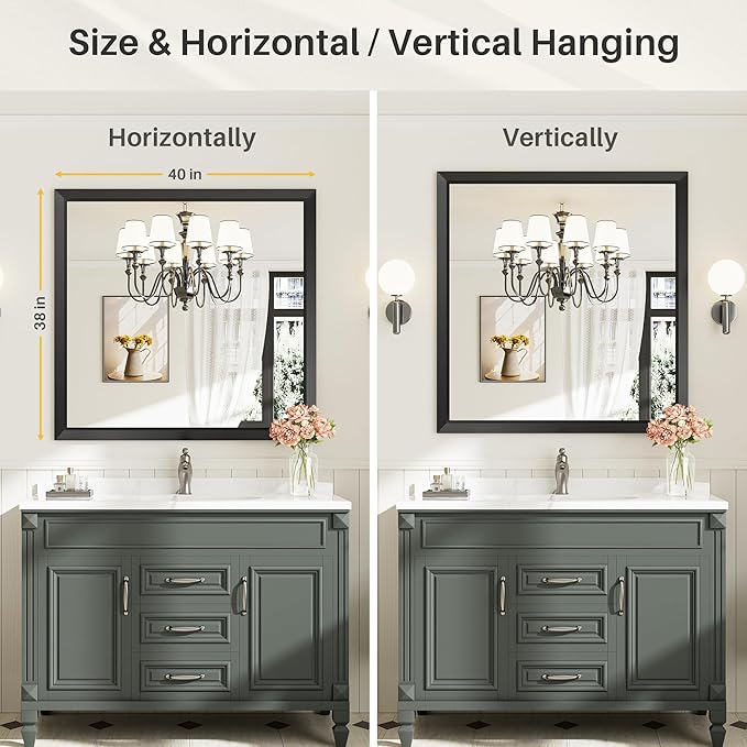 40x38 Inch Black Bathroom Mirror for Wall, Thick Metal Framed Rectangle Mirrors for Over Sink, Bedroom, Living Room, Entryway, Anti-Rust, HD Tempered Glass