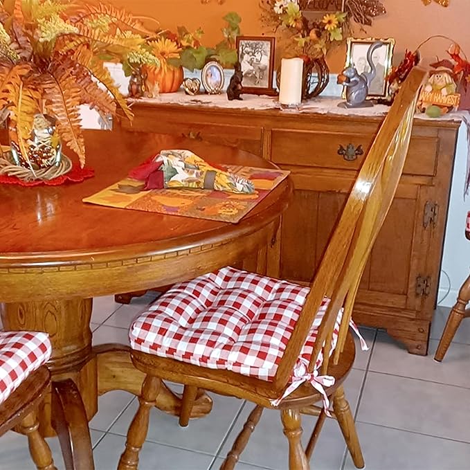 - Machine Washable Indoor Chair Cushions: These kitchen chair pads are machine washable for easy cleaning and maintenance; kitchen seat cushions are reversible to the same Classic Check Red Design
