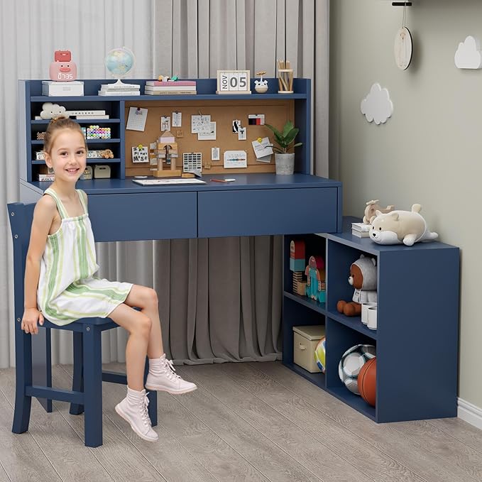 Blue Wooden Kids Desk and Chair Set,RUPOLX Kids Study Table and Chair Set with 2 Drawers & 4 Cabinets, Kids Study Desk with Removable Large Storage Cabinet,Girls Study Desks for Kid for Bedroom-NTU9XC
