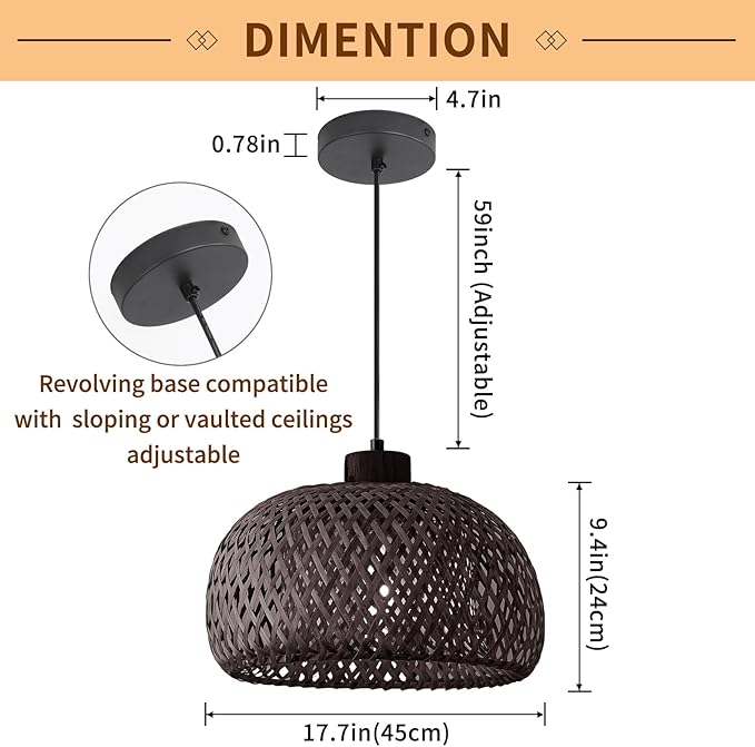 - 【Adjustable Height & Sloped Ceiling Compatible】 This woven pendant light features a shade with a maximum diameter of 18 inches (45 cm) and a height of 9.4 inches (23.8 cm), paired with a wooden canopy measuring 4.7 inches (12 cm). Its striking design creates an attractive focal point. Hardwired with an adjustable cord up to 59 inches, it's perfect for various ceiling types, including flat, sloped, and vaulted ceilings.