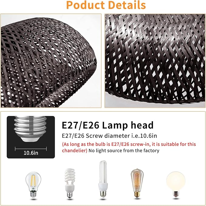 - 【Bulb Compatibility】 This pendant light is compatible with most E26/E27 base bulbs, including LED, incandescent, CFL, and halogen, supporting up to 60W. This versatility allows you to choose the ideal brightness and energy efficiency for your space. (Bulb not included). Perfect for customizing your lighting needs while adding style to any room.