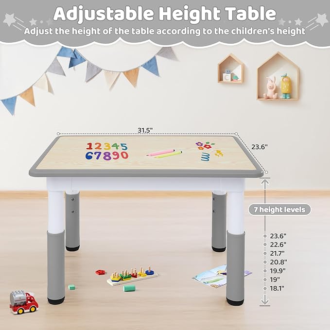 Toddler Table, 7 Level Height Adjustable Kids Play Furniture for Ages 3-8, Rectangular Plastic, 23.6" W x31.5 L, Multi-Activity Desk with Graffiti Desktop for Home & Daycare