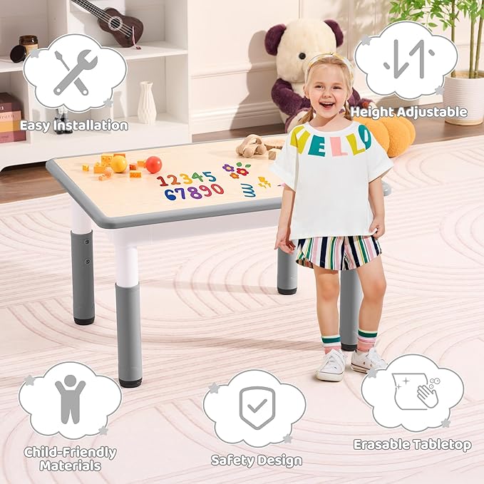 - Easy to Install: This kids dining table adopts a pre installation mode before being packed into the packaging box, we have also prepared an installation manual. After receiving the table, you only need to insert the table legs into the grooves at the bottom of the toddler eating table and adjust the height of the table legs to get a beautiful children's play table.
