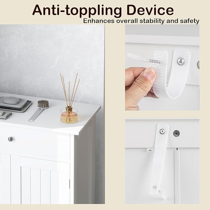 - Sturdy Construction: Crafted from thick boards, this bathroom cabinet ensures great sturdiness and durability. The anti-toppling device enhances overall stability and safety, while the anti-slip foot pads protect floors from scratches.