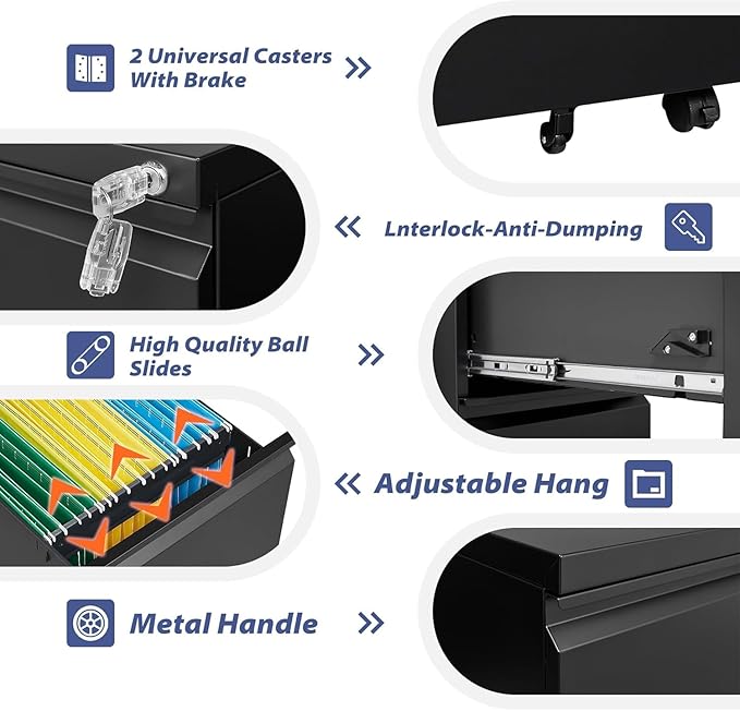 - 【Interlocking System】:The anti-tilt device allows only one drawer to be opened at a time, preventing the filing cabinet with lock from tipping forward. Furthermore, our under desk filing cabinet is equipped with a central lock, which can secure all drawers with just one key, adding an extra layer of security to your home or office.