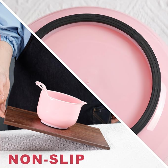 - Non-Slip & Non-Stinky: The rubber layer at the base will keep these batter bowls from skidding or slipping during mixing. Ingredients won’t stick with the bowl’s non-stick surface, making lengthy mixing less tiring.