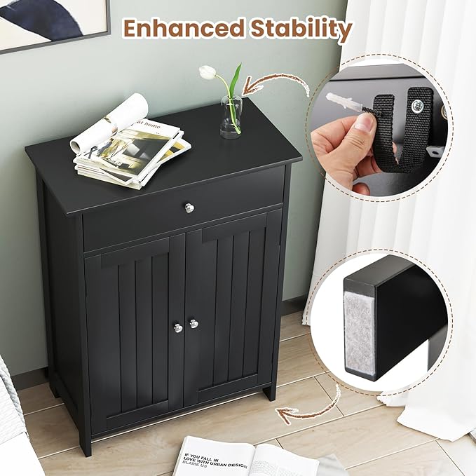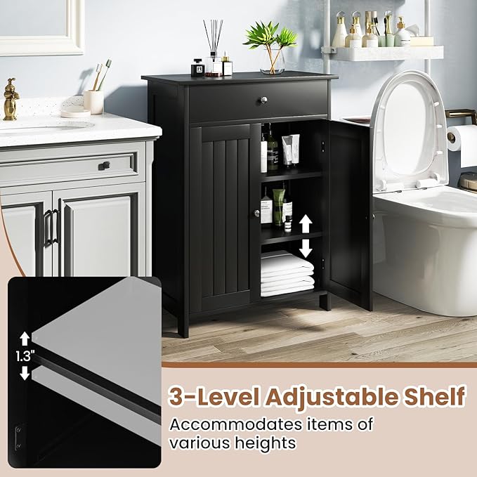 Giantex Storage Cabinet, Freestanding Bathroom Cabinet with 2 Doors, 1 Drawer, 3-Level Adjustable Shelf, Modern Wooden Storage Organizer for Laundry Room, Entryway, Living Room (Black)