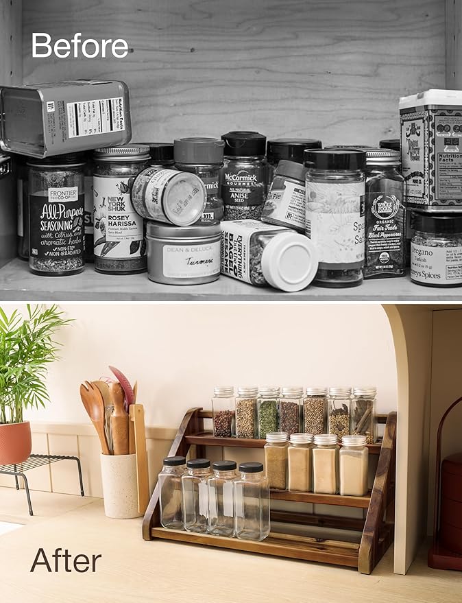 - Multi-Functional Spices Organizer: This spice organizer goes beyond spices; use it to neatly store essential oils, baking supplies, supplements, or other small kitchen items, making it a practical kitchen spice organizer and a must-have cabinet organizer shelf
