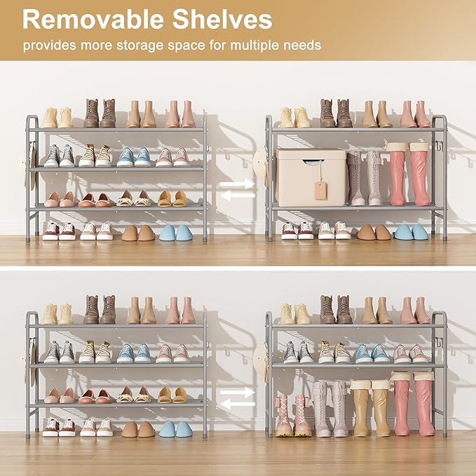 3 Tier Shoe Rack 33" Wide Metal Shoe Organizer Long Shoe Storage with 4 Side Hooks Sturdy Shoes Shelf for Front Door Entrance, Closet, Garage, Dorm, Grey