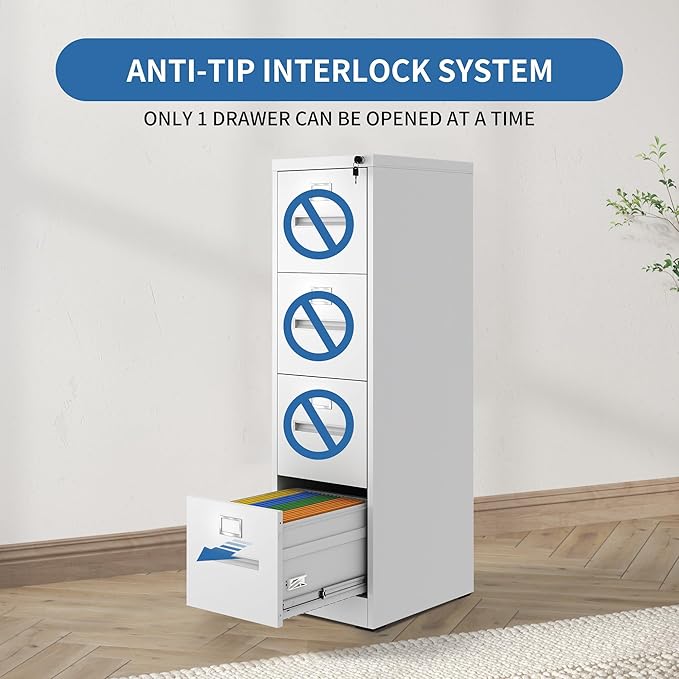 - 【Stability & Security】Our heavy-duty 4-drawer metal file cabinet is engineered for ultimate stability and safety with its one-drawer-at-a-time mechanism.Unlike flimsy designs that allow multiple drawers to open,creating a dangerous imbalance.Our file cabinet locks adjacent drawers when one is extended, ensuring perfect weight distribution and preventing tipping.