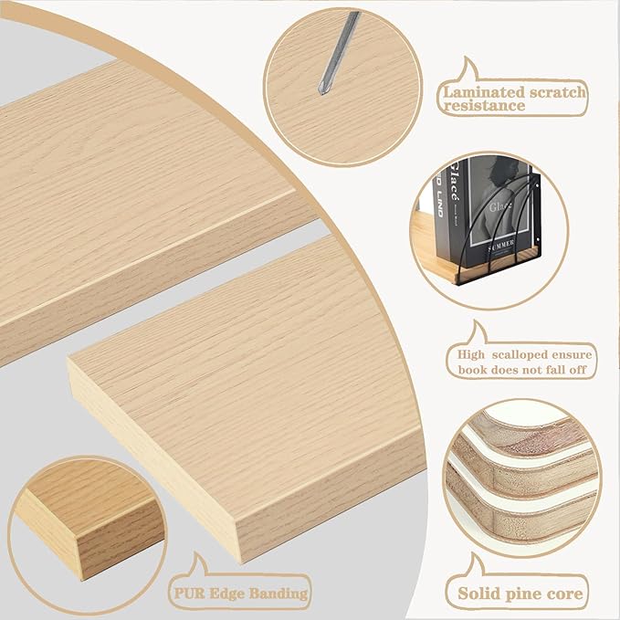 - 【Engineered Wood Excellence of Oak Floating Shelves】Solid pine core for natural strength & eco-friendliness.Realistic wood-grain composite surface of white oak shelves,combines the warmth of real wood with MDF-grade waterproofing & scratch resistance