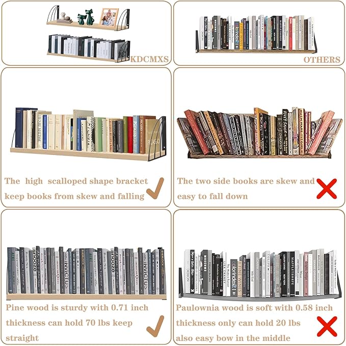 - 【Prevents Book Sliding & Falling System】Engineered with a high curved bracket retention system, our white wall bookshelf 48 inch securely keep books upright and organized—no more tilted stacks or scattered falls. Unlike basic triangular brackets of 48 inch floating book shelves for wall that compromise center-of-gravity stability, our ergonomic fan-shaped design locks books in place.