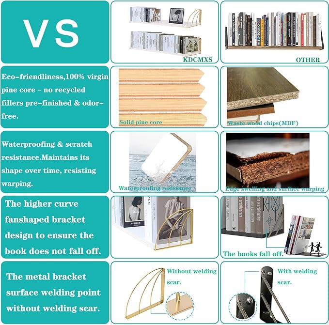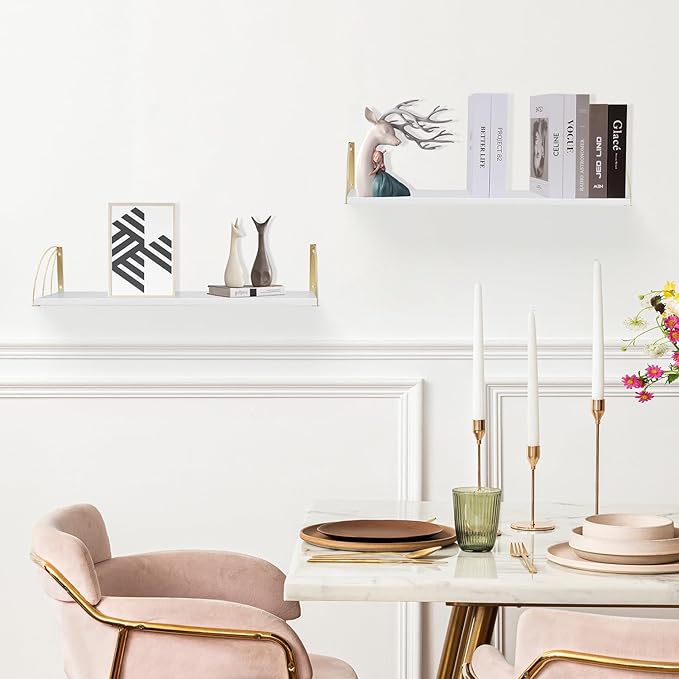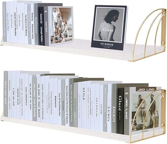 - 【Engineered Wood Excellence of Gold Floating Shelves】Solid pine core for natural strength & eco-friendliness.Realistic wood-grain composite surface of white gold shelves,combines the warmth of real wood with MDF-grade waterproofing & scratch resistance