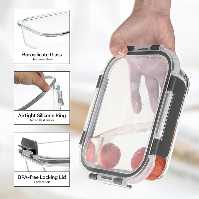 - AIRTIGHT SEALED LIDS: Equipped with BPA-free plastic lids featuring silicone seals, these glass storage containers with lids keep your food fresh longer while preventing leaks and spills. Ideal for bringing meals to work, the gym, or on picnics.