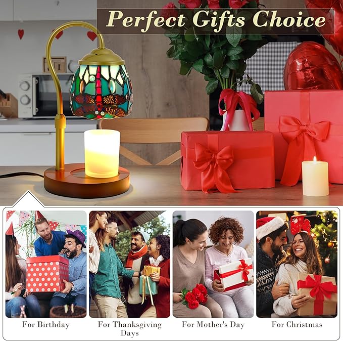- Upgraded Candle Lamp with Beautiful Lampshade: This Tiffany dragonfly-style lamp candle warmer for jar candles is handcrafted from multiple pieces of stained glass, paired with a premium wooden base. Each candle warmer light is a one-of-a-kind work of art! This candle warming lamp with 50W professional halogen bulbs for no open flame heating, evenly distributes heat, achieves fast fragrance diffusion, is clean, efficient, and long-lasting.