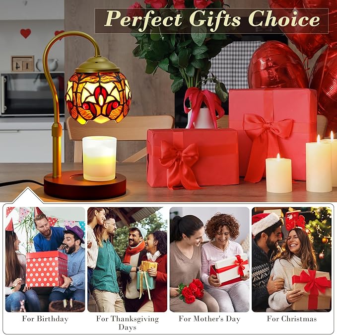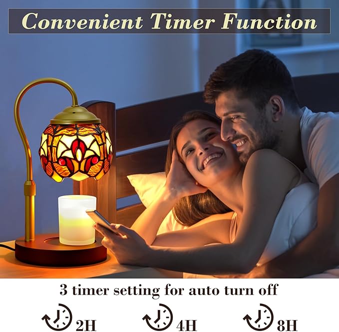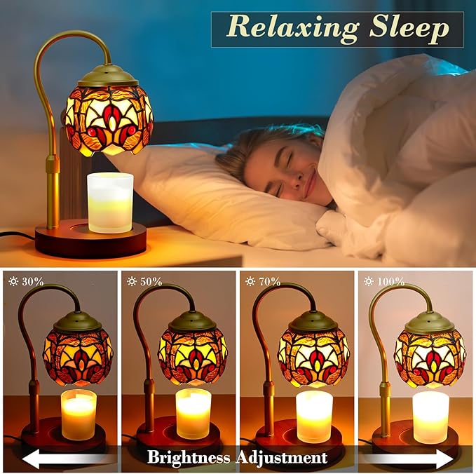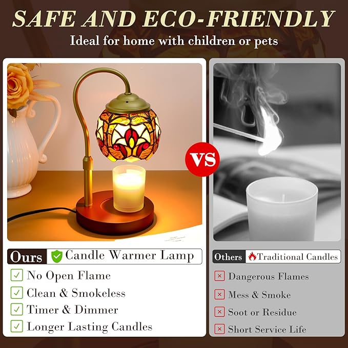 - Upgraded Candle Lamp with Beautiful Lampshade: This Tiffany baroque-style lamp candle warmer for jar candles is handcrafted from multiple pieces of stained glass, paired with a premium wooden base. Each candle warmer light is a one-of-a-kind work of art! This candle warming lamp with 50W professional halogen bulbs for no open flame heating, evenly distributes heat, achieves fast fragrance diffusion, is clean, efficient, and long-lasting.