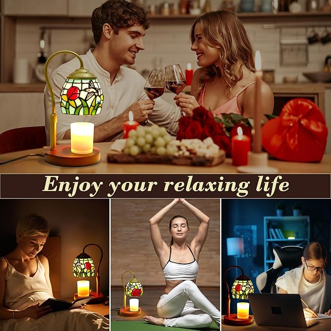 - For Most Types of Candles: It is 4 inches from the lampshade to the base and is compatible with most candles, such as jar candles. The wooden base of this modern candle warmer is equipped with non-slip pads to ensure stability and safety when you use this flower candle warmer lamp; this vintage stained glass lamp is perfect as a beautiful home decor in your bedroom, living room, study, office, and yoga room.
