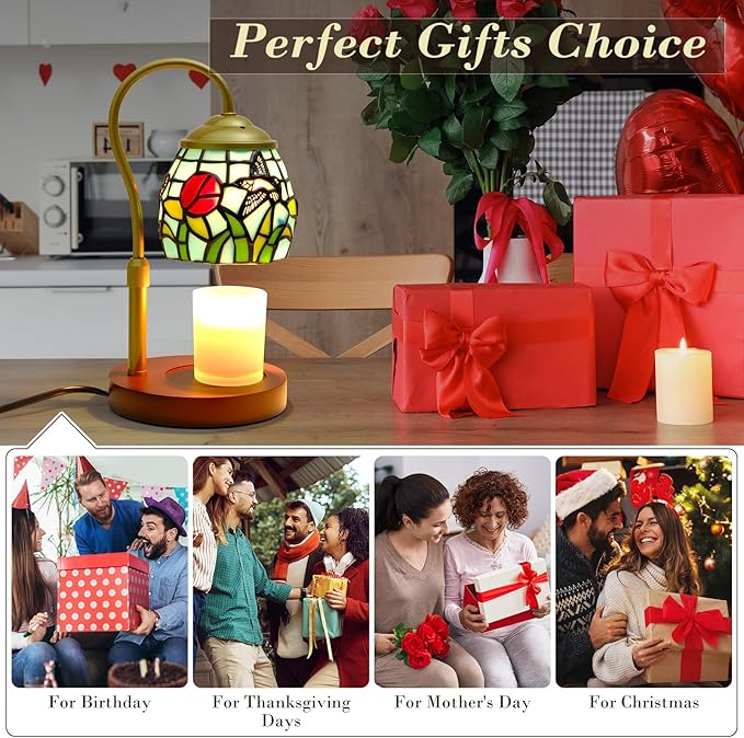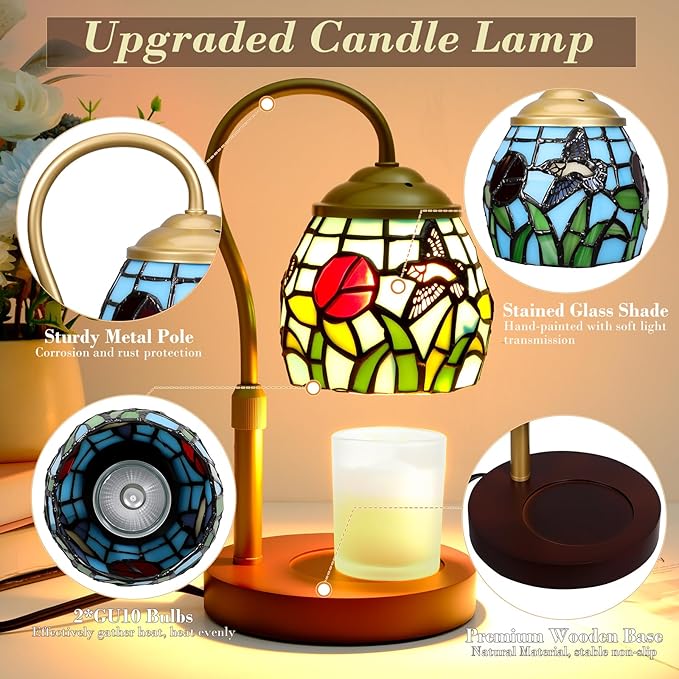 - Upgraded Candle Lamp with Beautiful Lampshade: This Tiffany hummingbird-style lamp candle warmer for jar candles is handcrafted from multiple pieces of stained glass, paired with a premium wooden base. Each candle warmer light is a one-of-a-kind work of art! This candle warming lamp with 50W professional halogen bulbs for no open flame heating, evenly distributes heat, achieves fast fragrance diffusion, is clean, efficient, and long-lasting.