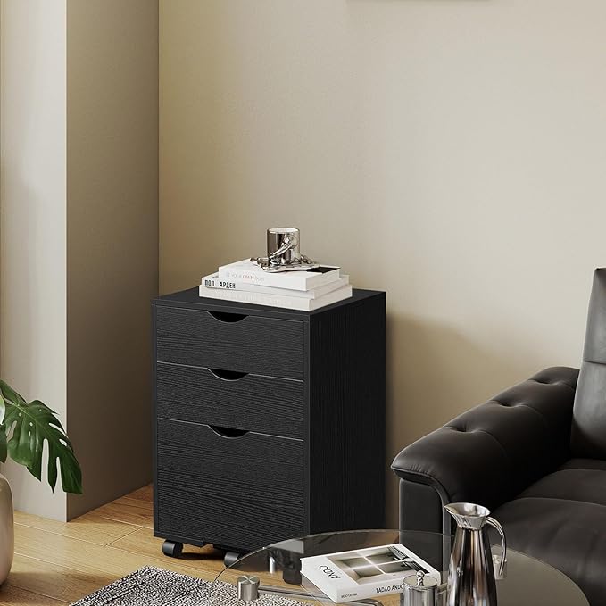 HollyHOME 3-Drawer Wood File Cabinet, Under Desk Cabinet for Home Office, Rolling Storage Shelf for Home, Printer Stand, for A4, Letter-Size Files, 11.8in Hanging File Folders, Black