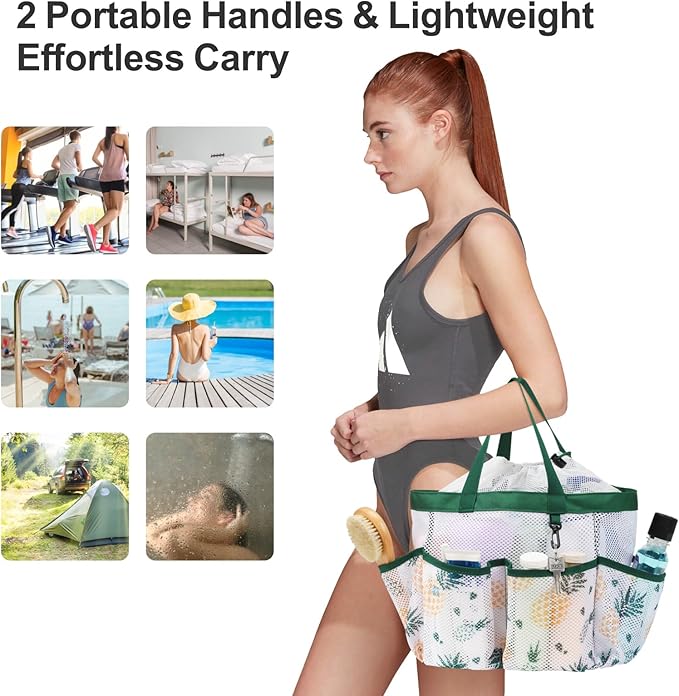 F-color Mesh Shower Caddy Portable with Drawstring - Upgrade Deeper 7 Pockets Dorm Room Essentials for Guys Girls with S Hook, Shower Bag Basket Tote for College Camping Bathroom, Green Pineapple