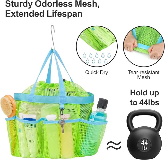 - Sturdy Odorless Mesh for Long-lasting Use: Crafted from tough, tear-resistant mesh that dries quickly and stays odorless, our mesh shower caddy keeps your toiletries clean and dry—no more sticky hands or unpleasant smells. With a strong build supporting up to 44 lbs, it securely organizes all your essentials