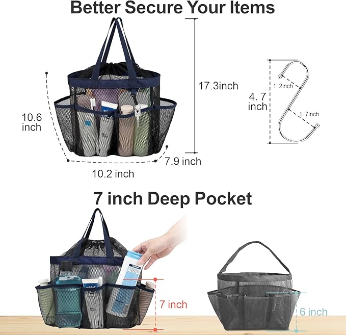 - 7 Upgraded Deep Pockets & Secure Drawstring for Peace of Mind: This shower tote bag features 7 upgraded exterior pockets with 7-inch depth, keeping tall bottles upright to prevent spills. A secure drawstring closure ensures toiletries stay safely inside—no more spills or lost items while you’re on the move