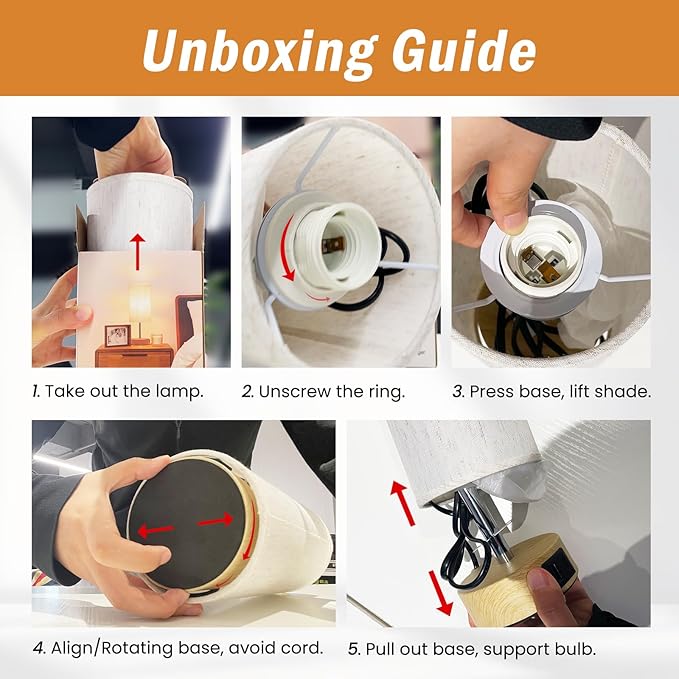 - ❤️【Unboxing Guide】― Open the package and take out the lamp, Unscrew the fixing ring on the lamp base. Carefully separate the lampshade from the base: keep the base centered inside the shade, check that the power cord is not stuck at the bottom, keep the base steady with one hand while using the other hand to separate the shade bracket from the base, and if it feels tight, gently move the base side to side until it comes out smoothly.
