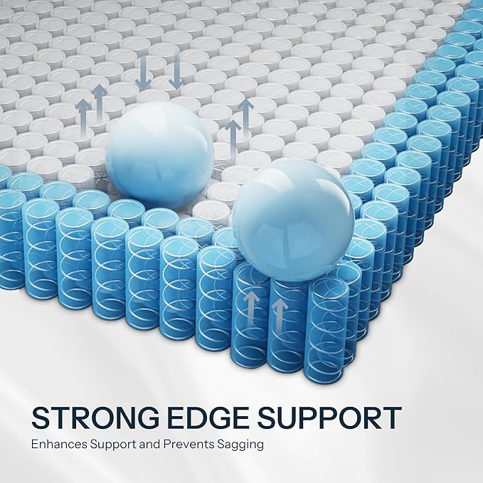 - 【Uninterrupted Sleep with Reduced Motion Transfer】Designed for undisturbed rest, this hybrid foam mattress absorbs movement, so you won’t feel a thing when your partner shifts during the night. The individually pocketed coil system delivers targeted support while minimizing motion transfer for a stable, peaceful sleep experience. Reinforced dual-edge support enhances stability, prevents roll-off, and maximizes usable sleep space. Plus, with excellent breathability, stay cool and comfortable for a deep, uninterrupted night’s sleep.