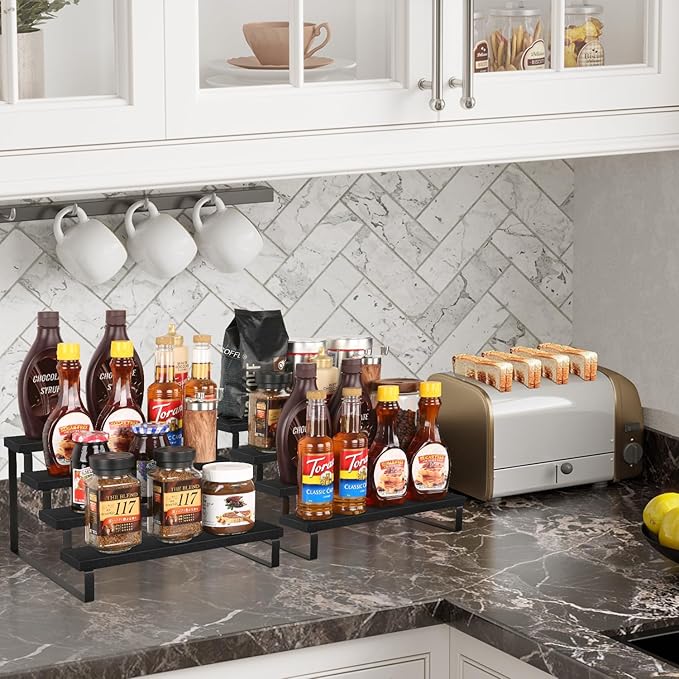 - Quick Setup & Easy Cleaning: You can have this 4-tier display riser stand assembled in 10 minutes with detailed instructions and tools. The wooden surface is waterproof and dust-free, a damp cloth could keep the counter shelf clean. (Assembly tools and accessories are included in the package)