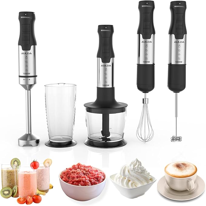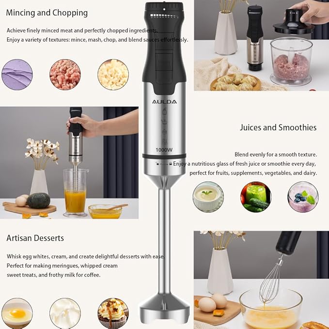 - 【POWERFUL AND FAST】Equipped with a robust 1000W motor, the Aulonda immersion hand blender is significantly more powerful than most traditional hand blenders. It effortlessly handles any recipe or smoothie with minimal cleanup, offering you a unique culinary experience. Ideal for efficiently cutting through even the hardest ingredients.