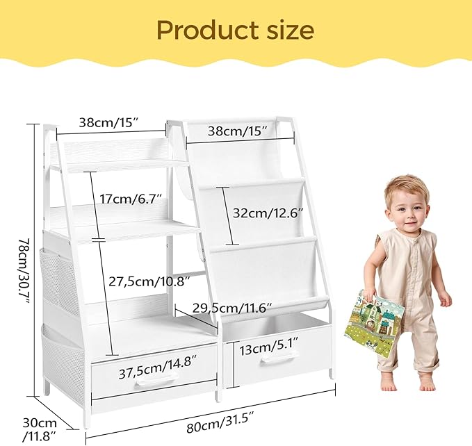 - Spacious Storage: Sized 31.5"L x 11.8"W x 30.7"H, the kids bookshelf has 3-tier Oxford fabric sling shelf, 3-tier Storage Shelves, 2 fabric drawers and 1 side pocket. It offers ample space to store and display books and toys, keeping the room neat and organized