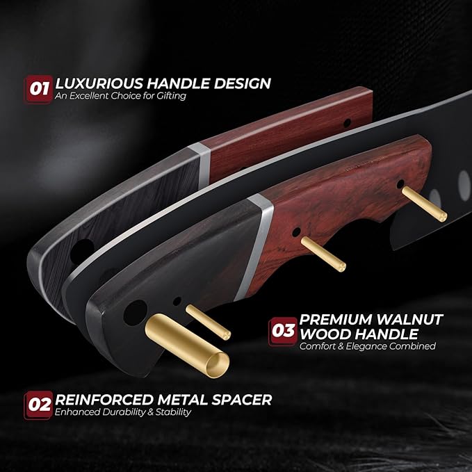 - Ergonomic Walnut Handle – Designed for Comfort & Control.Combining natural elegance with superior ergonomics, the hand-polished walnut wood handle features a sculpted finger groove for a secure, fatigue-free grip. Reinforced with a metal spacer and full-tang structure, it offers balance, durability, and long-term comfort. Whether you're slicing or chopping, this handle provides the control professionals demand with the style you’ll love.