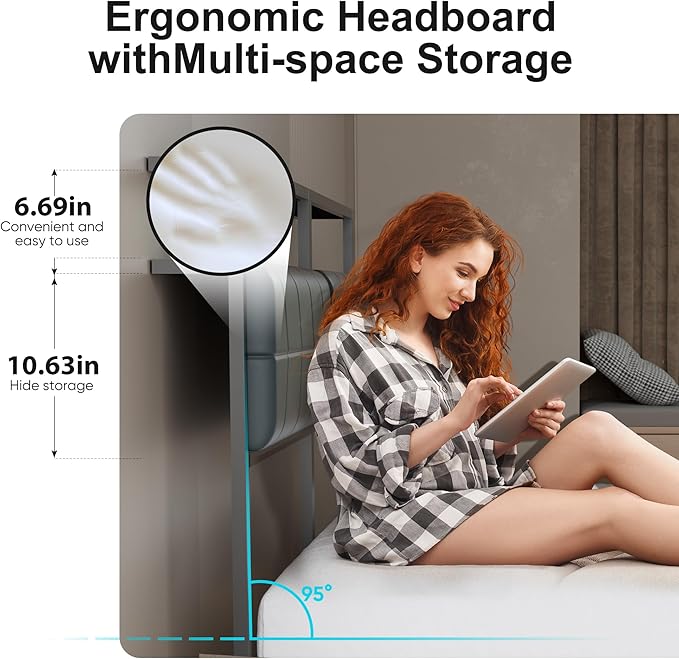 - MULTIFUNCTIONAL STORAGE SPACE: This queen bed frame with storage comes with 2 tiers of storage shelves on the headboard, which can easily organize small items such as cell phones, glasses and books. The underbed storage space can easily store luggage, shoeboxes and some organizers, and the sweeper can easily pass through to keep the bedroom clean and tidy.
