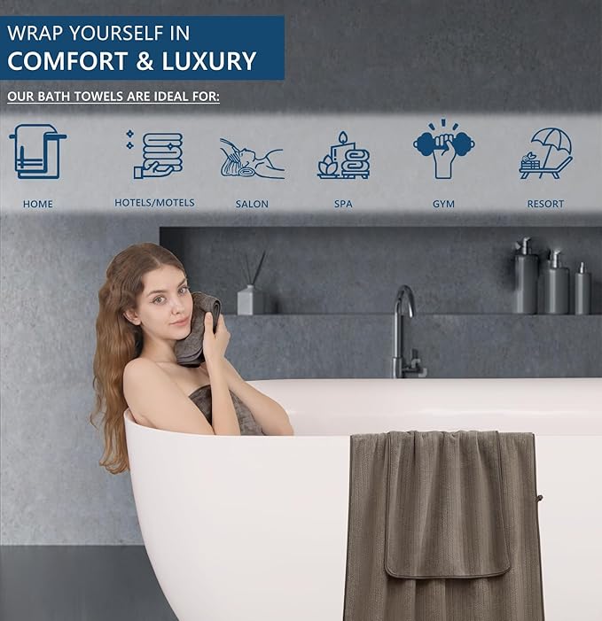 - Lightweiht Lasting Durable:Bath towel set is lightweight and durable,shower towel edges with professional hemmed seaming finish,prime quality towel set have a reinforced double stitched hem, designed to prevent fraying and tearing while remaining soft.Your towel will be durable and maintain its best condition,The towel is soft and delicate, which is very suitable for people with sensitive skin.The soft looped cloth will not harm your skin.