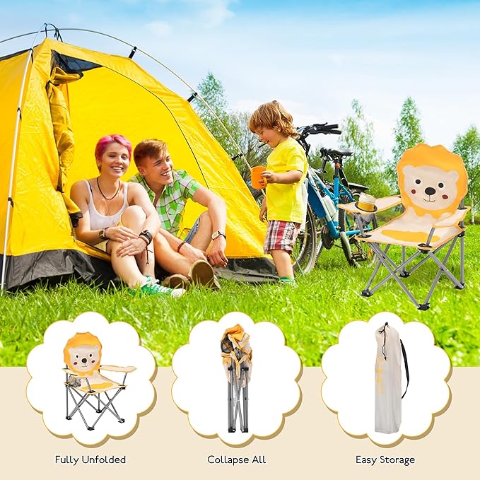 XMT Kids Folding Chair with Cup Holder - Portable Lightweight Outdoor & Indoor Chair for Children Ages 3-9, Anti-Slip Base, Sturdy Metal Frame, Compact Foldable Design with Carry Bag (Yellow/Brown)
