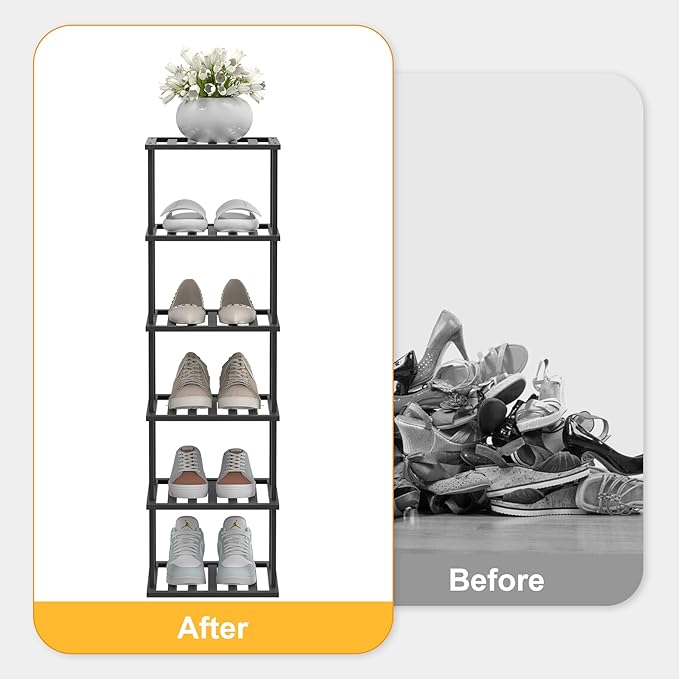 6-Tier Free Standing Shoe Racks, Bamboo Wood Shoe Rack for Entryway & Closet, Beautiful | Natural | Functional | Sturdy Shoe Rack Small Shoe Shelf for Small Spaces and Narrow Spaces Black