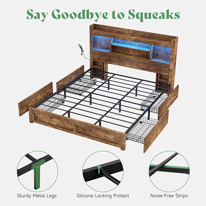 AMERLIFE King Size Bed Frame with 4 Storage Drawer & 2 Slide Bedside Table, Wood Bed Frame with 49.6" Tall Bookcase Headboard, LED Platform Bed with Charging Station, No Box Spring Needed/Rustic Brown