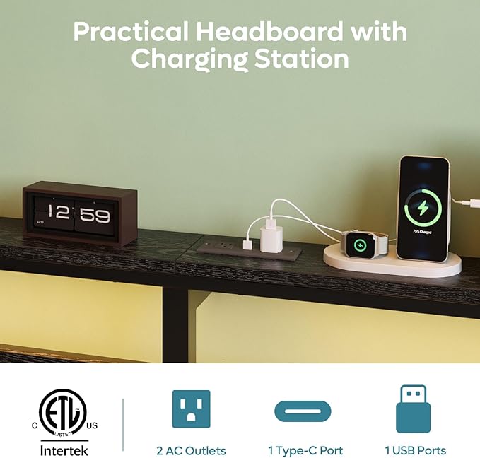 - 【Convenient Charging Station & LED Light】 The full bed frame with headboard features 1 Type-C, 1 USB A port, and 2 AC outlets to keep your devices powered and within easy reach. Use the remote, app or wire control to select from 22 dynamic modes and 7 colors to match your mood.