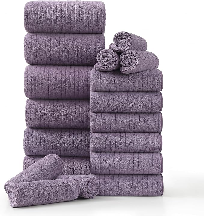 - SOFT TOUCH AND DURABLE:18 pack towel set have a reinforced double stitched hem and natural weave guarantees durability and strength. luxury towel set are made up of 100% microfiber and soft fleece plush material which allows them to be extremely absorbent,soft and fluffy.The soft touch of these luxurious and remarkably plush towels allows you to feel spa grandeur in the comfort of your own home.