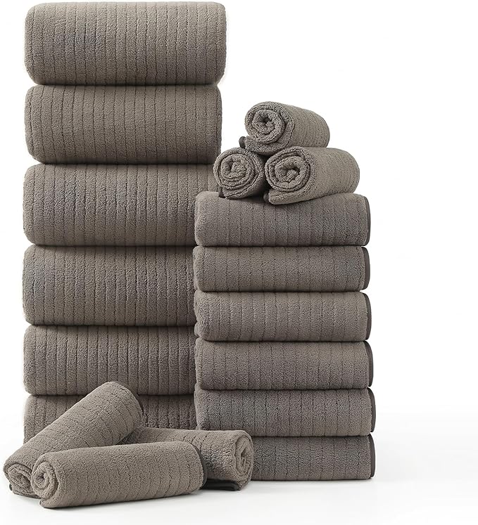 - SOFT TOUCH AND DURABLE:18 pack towel set have a reinforced double stitched hem and natural weave guarantees durability and strength. luxury towel set are made up of 100% microfiber and soft fleece plush material which allows them to be extremely absorbent,soft and fluffy.The soft touch of these luxurious and remarkably plush towels allows you to feel spa grandeur in the comfort of your own home.